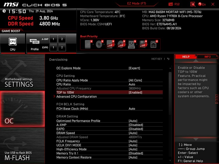 今天,微星官方宣布,将为旗下 600 系列主板推出了新 BIOS,内有AMD 新的微代码 AGESA BIOS PI 1.2.0.1 ,最大变化是增加了“TDP to 105W”选项,开启后, Ryzen 9600X 和 9700X 的TDP 将解禁,从65W升至 105W。