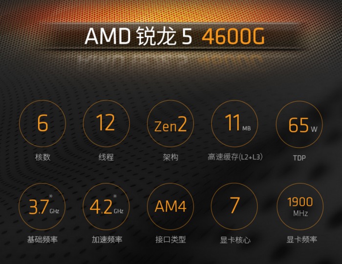 R5 4600G APU 采用 Zen2 老架构,为 6 核 12 线程,核心默频 3.7GHz,最高可加速至 4.2GHz;集成了核显为 Vega 7,频率可达 1900MHz,对于网游和一般3A游戏压力不大。