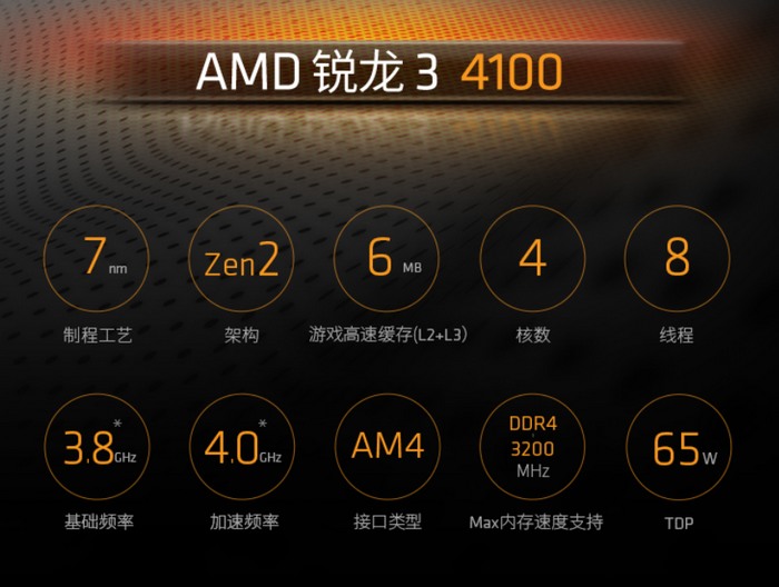 AMD Ryzen 3 4100 采用老的 Zen 2 架构,7nm 工艺打造,4 核 8 线程,6MB 三级缓存,基础频率 3.8GHz,最高可加速至 4GHz,TDP 65W。