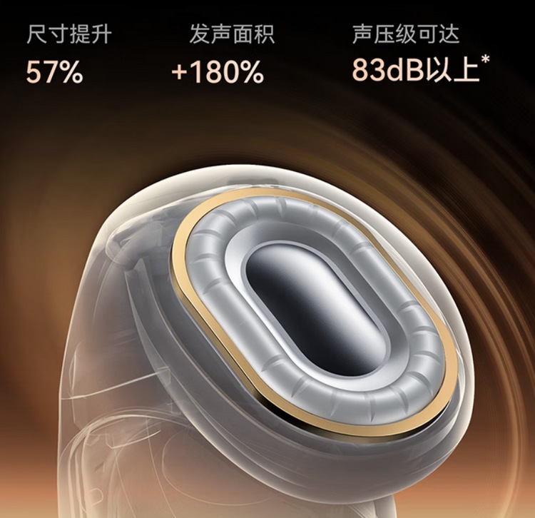 内采用17mm定制“跑道”式单元,83dB声压,发声面积180%,并支持定向传音和360度环绕音,升级空间声场算法,重现三维音频环境,拓宽声场宽度和深度。此外,还支持 BassUP 低音增强技术。