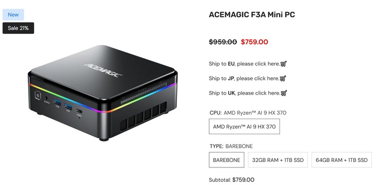 前不久曝光的阿迈奇 ACEMAGIC F3A 迷你主机上市了,已在官网开启预售,售价759美元(约5500元)起,配置强大,采用AMD新锐龙 Strix Point APU 处理器,拥有强大的RDNA 3.5 架构核显,游戏性能出色。
