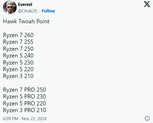 关于型号,目前业内已经曝光了,有:AMD 锐龙7 260、锐龙7 255、锐龙7 250、锐龙5 240、锐龙5 230、锐龙5 220、锐龙3 210 共7款;另外,还有 Pro 商用本的版本:有四款,型号中加入了 Pro ,有锐龙7 PRO 250、锐龙5 PRO 230、锐龙5 PRO 220、锐龙3 PRO 210。