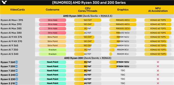 据了解,锐龙200 系列是现有锐龙8040系列(Hawk Point)的翻版,而锐龙8040系列本身就是锐龙7040系列(Pheonix)简单提升NPU算力而来,它们都基于Zen4/Zen4c CPU架构、RDNA3 GPU架构、XDNA NPU架构。