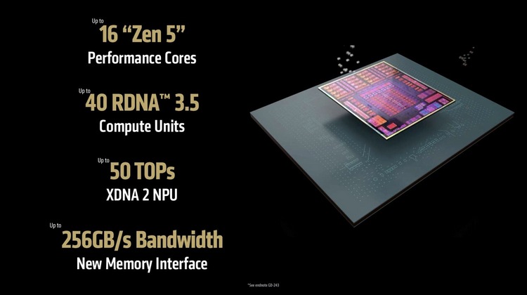 16核/32线程,最高加速5.1GHz,80MB 缓存,50 TOPS 算力,45-120W cTDP 功耗,40单元核显(Radeon 8060S)
