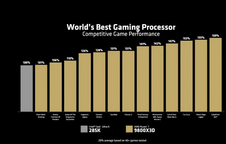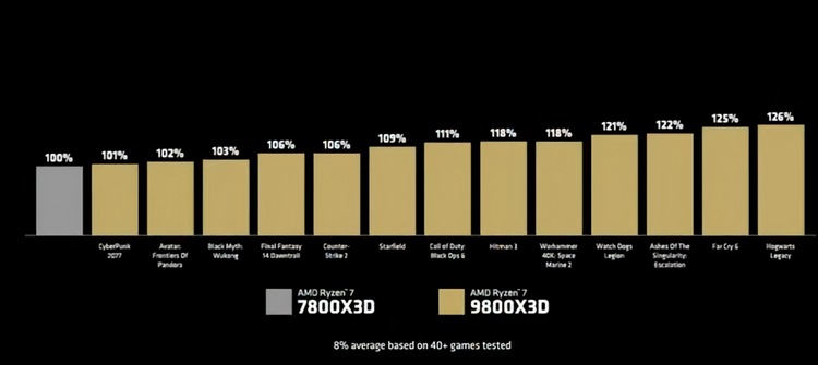 性能上,与前代产品相比,游戏性能平均提高了 8%(7800X3D),比英特尔 Ultra 9 285K 快 20%。