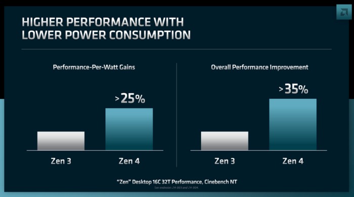 至于能效比和性能,官方表示 Zen4 架构比 Zen 3 架构 IPC 提升约 8%-10%,与 Zen3 架构相比,新架构的每瓦性能提高了 25% 以上,整体性能提升了 35%。以上数据基于 Cinebench 跑分。