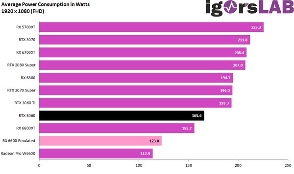 最终,他们成功将主频超到了2331MHz,加速频率来到了2580MHz,显存是16Gbps等效。但测试结果显示游戏时的功耗为123W左右,比预期要低的多,超频后也只比Radeon Pro W6600高大概10W,比RTX 3060更是低了约42W。