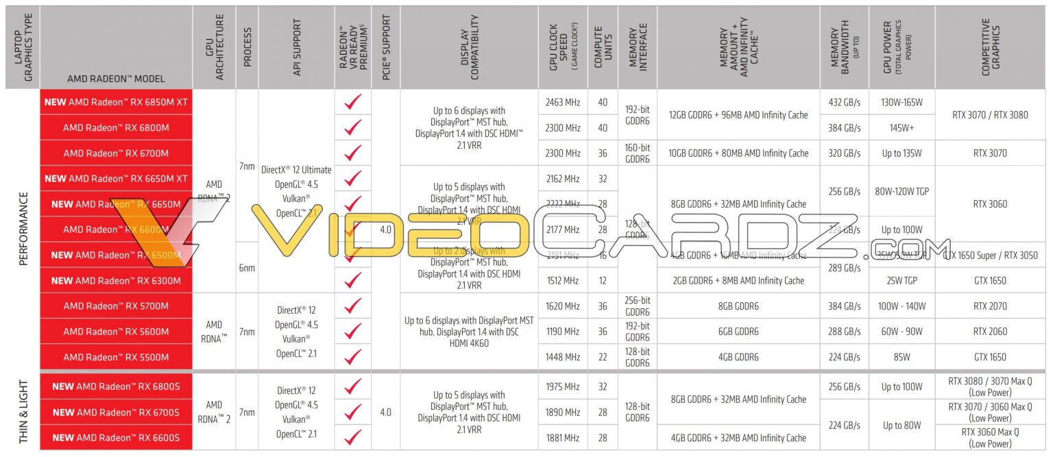性能方面,RX 6850M XT和RX 6800M分别对标RTX 3080/RTX 3070、RX 6700M对标RTX 3070、RX 6650M XT、RX 6650M和RX 6600M对标RTX 3060,RX 6500M对标GTX 1650S和RTX 3050,RX 6300M对标GTX 1650。比较特别的RX 6800S对标RTX 3080 /RTX 3070 MAX-Q低功耗版、RX 6700S对标RTX 3070 /RTX 3060 MAX-Q低功耗版、RX 6600S对标RTX 3060 MAX-Q。