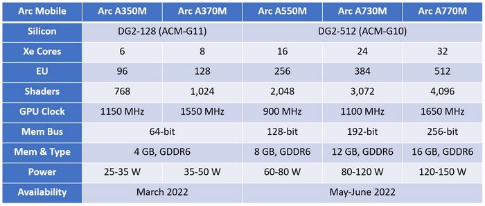 至于规格,锐炫 A350M 含有 6 个 Xe 核心,合计768 FP32 核心,频率 1150 MHz,配备了 4GB 64bit 位宽的 GDDR6 显存,25-35W 功耗。