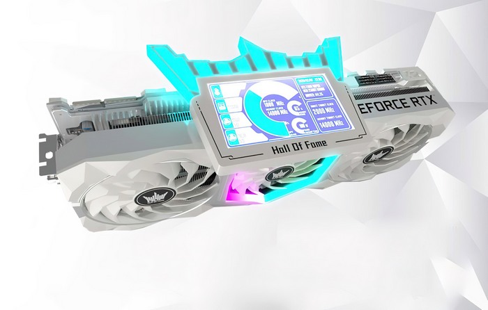 该卡依旧延续了经典白配色,配有硕大的三风扇散热器,有巨大的风扇(双102+92mm)、巨大的散热片,背后有硕大的背板。不过,最抢眼的是侧面的背光和巨大的屏幕,配有一块4.3英寸LCD彩屏,分辨率为 480 x 272,可以显示运行状态,温度、功率和模式等。不得不说,这块卡装机后的颜值,从侧面看一定很有辨识度。不过我们需要注意兼容性,毕竟高出来许多。
