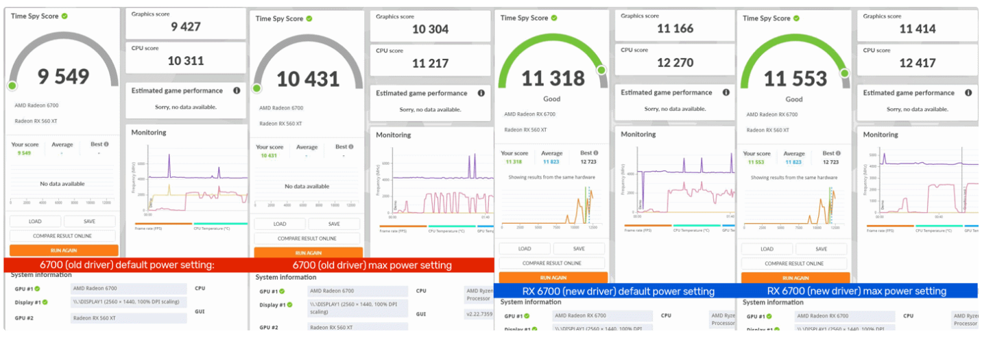 实际该卡的成绩不算优秀,3DMark 跑分最高超 RX 6650 XT 大概10%。而 RX 6700 XT 的分数又比 RX 6700 高 11% – 15%。