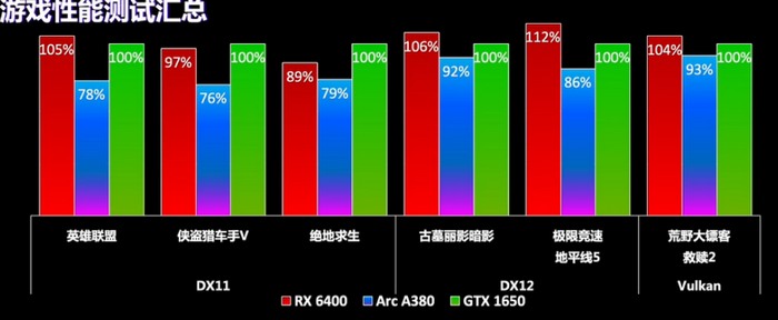 具体来说,“锐炫”A380 对比 GTX 1650和AMD RX 6400,在DX11环境下表现差距较大,在DX12种拉回一些,但还是比RX 6400稍逊一筹,游戏帧数相差大概10-20%的样子。