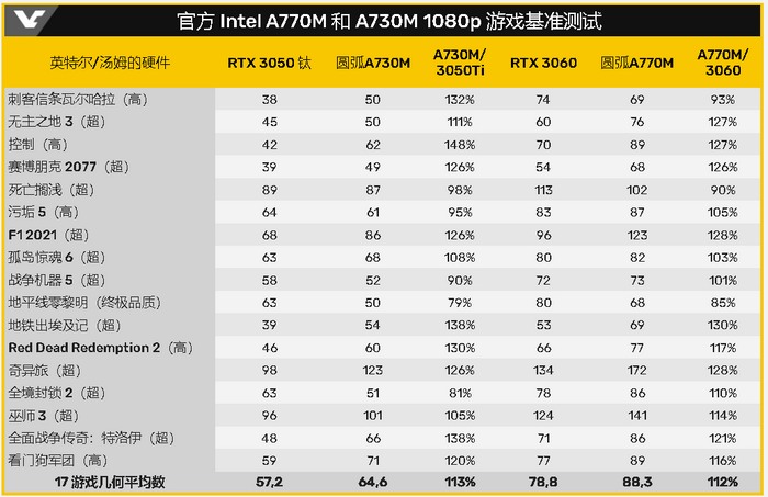 权威外媒汤姆硬件,发布了英特尔移动版“锐炫” Arc A770M 和 A730M 的详细评测,对比了多款搭载RTX 3060和RTX 3050Ti的笔记本,“直观”显示了各大游戏中的帧率。