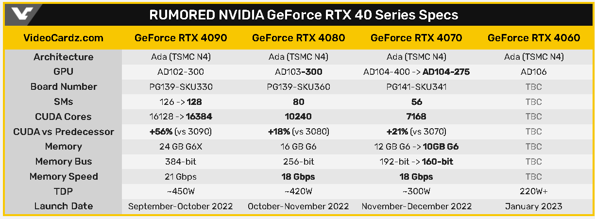 最后,RTX 4070 的规格也更新了,该卡不是 12GB 显存,而是10GB。这也意味着从 192 位宽降至 160位位宽。据说 RTX 4070 将具有 7168 个核心流处理器,这意味着 AD104 被屏蔽了512个核心。