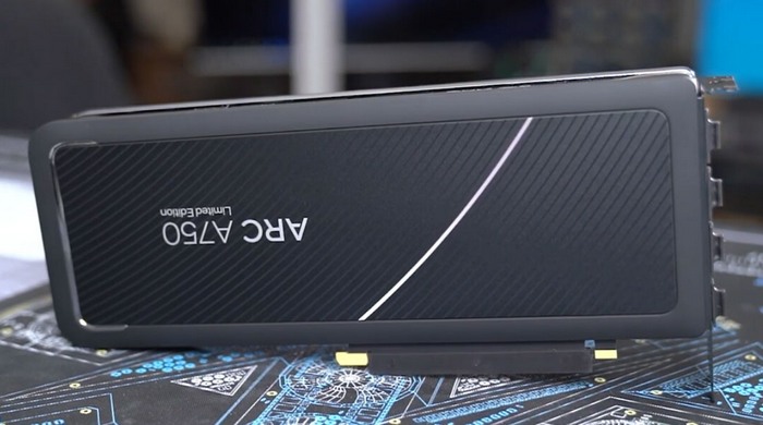 这是一块 Arc A750 桌面独立显卡,是背面图,和之前官方曝光的渲染图吻合,有大量纹理装饰,背后标注了“Arc A750”字样,这是7系已知的次旗舰型号,可能还有Arc A760。