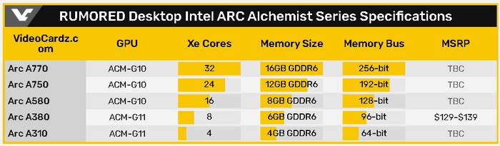 算上前不久的 Arc Alchemist A310 显卡,目前已知有5个型号了,具体规格VC整理了如下: