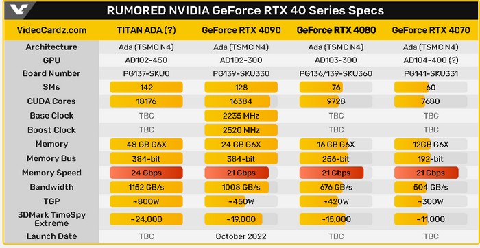 至于而更强大的24Gbps GDRR6X显存,可能不会出现在RTX 40系列,目前传闻说是会被部署在新款 TITAN 中,也有可能后期的RTX 4090 Ti 也会用上。