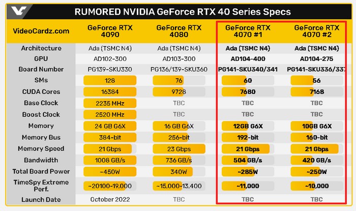 最初传闻说 RTX 4070 会配备10GB 160bit GDDR6显存,21Gbps等效频率,420GB/s总带宽;但现在又有一个显存版本,搭载12GB 192bit GDRR6显存,也是21Gbps等效频率,但总带宽提升至504GB/s。