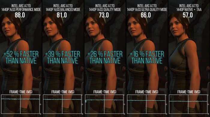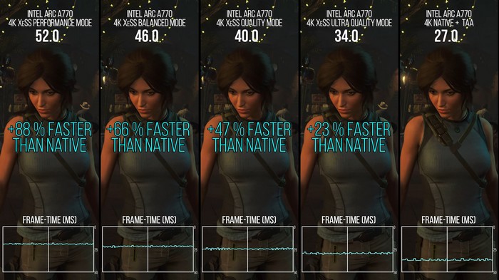 在光追等特效使用更加密集的游戏中,性能比例更有所提升。比如在《古墓丽影》的性能 / 超高品质预设下,XeSS 可较原生分辨率提升88% 的性能。
