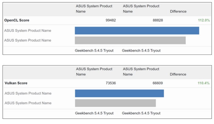 如图,测试平台均搭配 i9-12900KS 处理器、基于华硕 ROG Z690 APEX 主板、32GB DDR5内存,显示核心最高都是2.4GHz,并没有超频。测试项目有Vulkna和OpenCL。