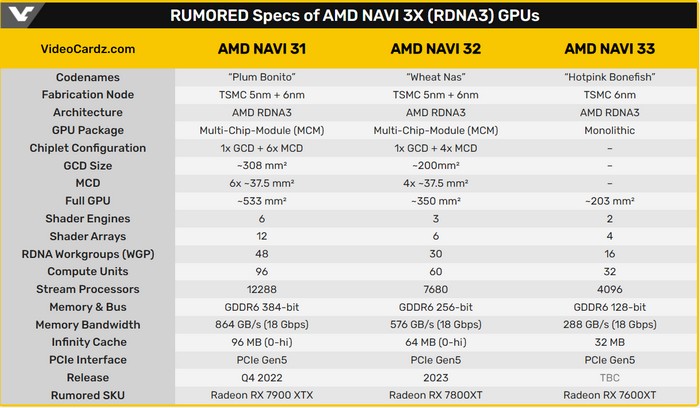 Navi 31代号为“Plum Bonito”,基于 5nm工艺打造,预计拥有 12288 个流处理器和 96MB 无限缓存。据说支持384bit位宽显存,Radeon RX 7900 XTX或配有24GB GDDR6显存,等效频率为20 Gbps。