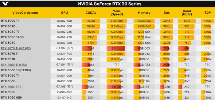 据VC搜集和整理的规格,NVIDIA RTX 3070 Ti基于GA102核心(设备ID 2200系列),规格方面预计完全不变。RTX 3060 Ti核心不变,显存从GDDR6升级为GDDR6X。
