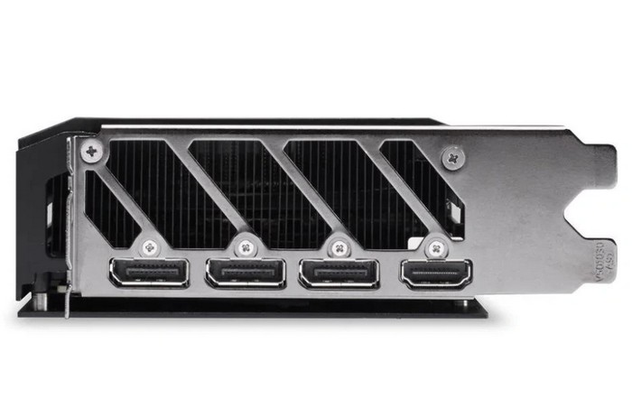 个头不算小,占用约2.5个槽位,目测至少有四根热管,双阵列散热模组,侧面提供双8Pin外接供电,背后有背板保护和加固。