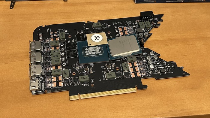 如图,采用异形PCB板,整个AD103核心个头不小,对比某第12代酷睿处理器大小差不多(算基板),核心面积可能比CPU的还要大一些。