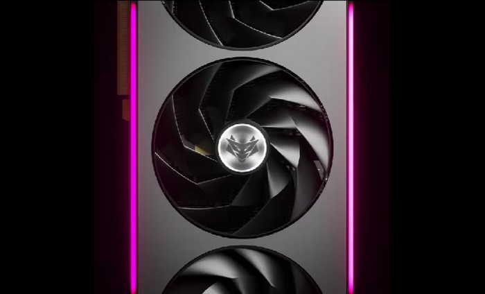 蓝宝石 RX 7900 系非公卡整体简约方正,采用 3 风扇散热器,风罩边缘一圈RGB灯效。值得一提的是,中间的风扇更大一些,而且转动方向和两侧风扇相反,这样可以降低扰流,获得更好的散热效果。