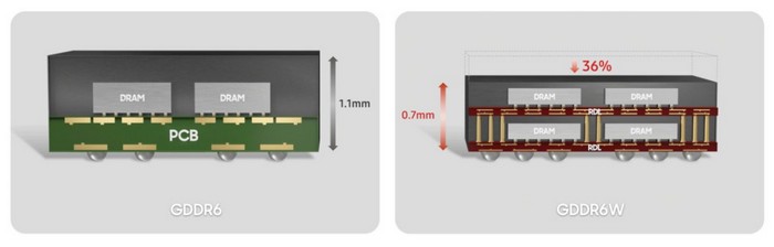基于 FOWLP 的 GDDR6W 显存颗粒厚仅为 0.7 毫米,比之前高度为 1.1 毫米的封装变薄 36%。尽管芯片是多层的,但它仍然提供与现有 GDDR6 相同的热特性和性能。然而,与 GDDR6 不同的是,由于每个封装的 I / O 翻倍,基于 FOWLP 的 GDDR6W 的带宽可以翻倍。