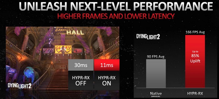 实战中,在《消逝的光芒 2》中,该技术可将帧率从 90 FPS 提高到 166 FPS,提升了 85%,延迟从 30 毫秒减少到 11 毫秒,没有说显卡型号,不过发布会上用的RX 7900 XTX。