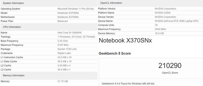 现在,一款型号为“X370SNx”的游戏本出现在GB数据库中,搭载酷睿i9-13900HX处理器(24C/32T)和最强的 RTX 4090 移动版独显。