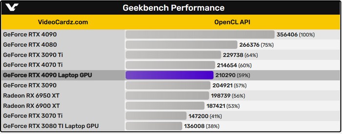 至于性能,该卡的 OpenCL 跑分为210290,比桌面版 RTX 4090 差许多,和即将登场的 RTX 4070 Ti 差不多,但比 RTX 3080 Ti 移动版快54%,比台式机 RTX 3090 还要强一些。