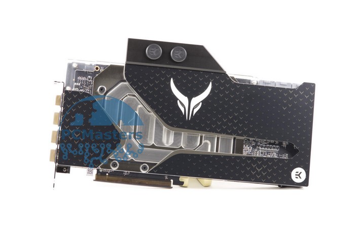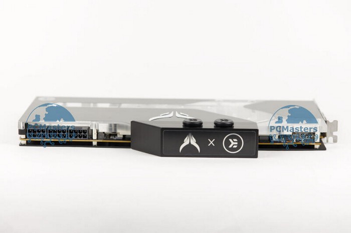 该卡是憾讯联合 EKWB(毅凯火力)一起打造的,配有 EK 的 Quantum Vector 一体水冷头,核心接触部分水槽加密,其他其余水道较宽。整个底座是镀镍电解铜材质打造的,顶部是亚克力板,旁边有黑化。