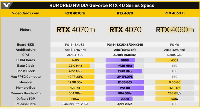 值得一提的是,RTX 4070 可能有两种核心,分别是AD104-250和251,预计都有 5888 个CUDA核心流处理器,搭配12GB GDDR6X 显存,预计功耗在200W左右,因为目前已知RTX 4060系列最高是180W。