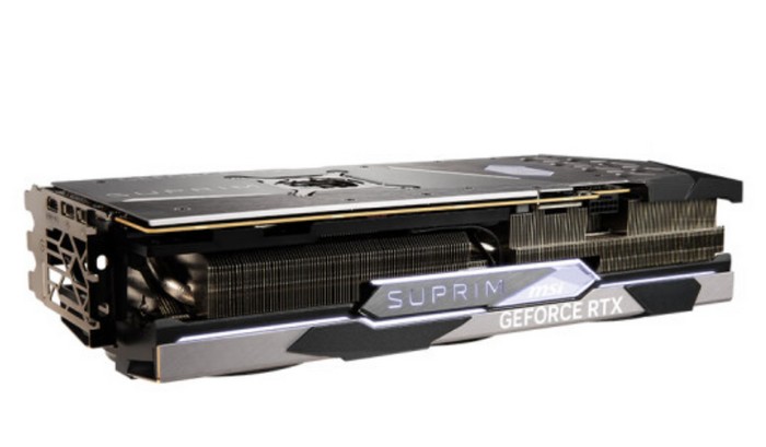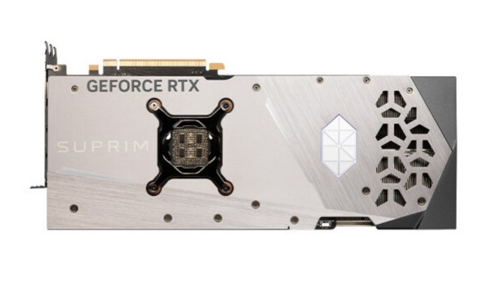 模具没变,和上代 RTX 3090 Ti SUPRIM 外观一样,整体硬朗。拉丝风罩钻石晶体几何形状,有RGB灯效,三把双滚珠轴承风扇,风扇边框是八角形切口和45°抛光斜边设计。