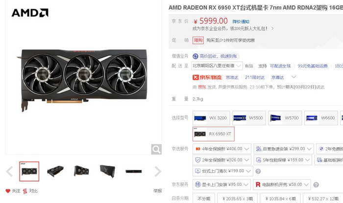 目前JD在售的 RX 6950 XT 纯公版价格只要5999元,而某品牌非公版也是5999元,都有现货。
