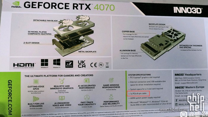 日前,显卡吧和CHH同时曝光了映众非公版 RTX 4070 的包装盒,在产品规格介绍处看到,它已经是标准版的8Pin 外接供电,而非新的16Pin(12VHPWR),这对于老玩家而言是好事。