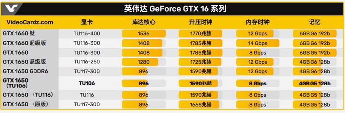 原始版本的 GTX1650 配置不高,后来还升级过G6显存(GTX 1656),频率也更高,后来还用过 GTX 1660 Ti 的 TU116核心,还出现了GTX 1650 Super(TU116),甚至还用过 RTX 2060、RTX 2060S 的 TU106 核心,只是显存频率并不高,还是跟 GTX 1656 以及 GTX 1650S 刻意保持了差距。