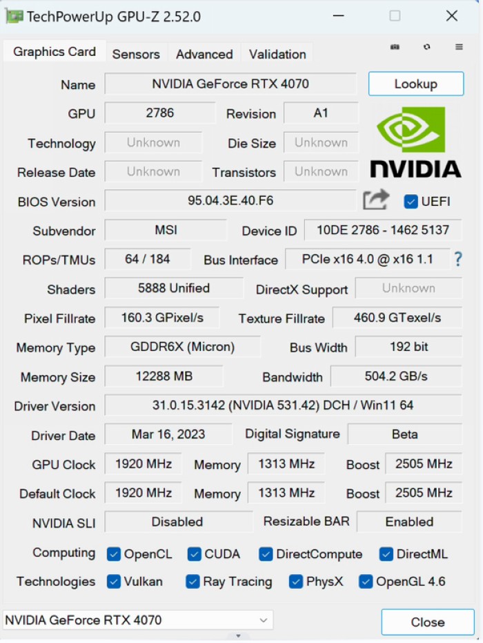 规格方面,GPU-Z截图看到,RTX 4070 有5888个核心流处理器,配有12GB GDRR6X(美光)显存,192Bit位宽,总带宽504.2GB/s。另外,核心默频1920 MHz,Boost 2505MHz,显存1313MHz。