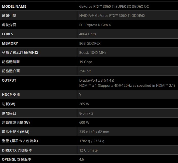 另外,该卡核心 Boost 频率为1845 MHz,GDRR6X显存等效频率19Gbps,265W TDP,有双8Pin外接供电。