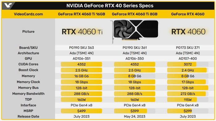 NVIDIA 已发布了 RTX 4060 系列显卡,有 RTX 4060 Ti 8GB、RTX 4060 Ti 16GB 和 RTX 4060 三款。