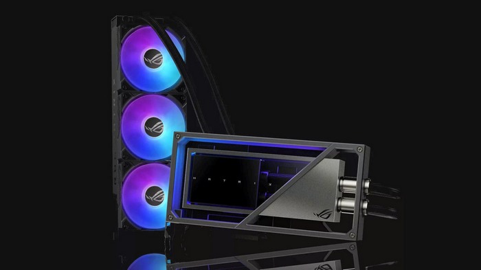 自带 360mm 水冷排,配备三把 ROG MF-12S ARGB 风扇,号称可压制最高450W时的热量,即使风扇在1000转以内,仍能确保核心温度在60摄氏度以下。另外,风扇采用触点供电方案,没有任何排线,因为供电隐藏在水冷管壁内。