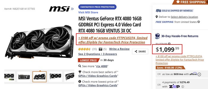 去年9月发布的 NVIDIA 次旗舰 RTX 4080 价格再刷记录。美国市场上,微星三风扇Ventus “万图师” RTX 4080 只要1099美元,再叠加上100美元优惠券,目前只要999美刀就能拿下了(折合7240元),首次跌破1000美元大关。