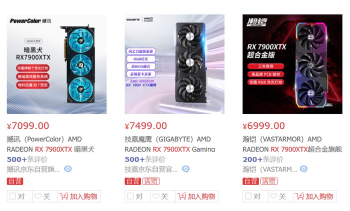 目前AMD RX 7900 XTX 售价普遍在7000冒头点,憾讯的暗黑犬和盈通的目前只要7099元,不知名品牌瀚铠的RX 7900 XTX 更是只要6999元。