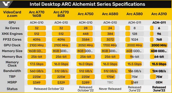 基于Arc A310平台,内有6个 Xe 核心,比 Arc A380 还少2个。不过核心频率不变也是2000MHz,搭配4GB GDRR6显存,64bit位宽,15.5GBps等效频率;作为对比,Arc A380 是6GB GDRR6显存,96bit 位宽,15.5Gbps 等效频率。