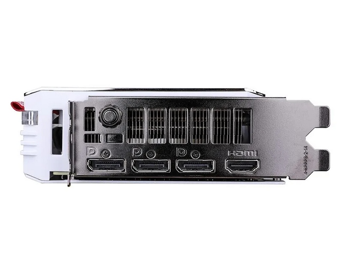 尾部的扩展包括:3个DP 1.4和一个HDMI 2.1,旁边还有个一键超频按键,可以快速拉升频率,具体规格稍后再说。