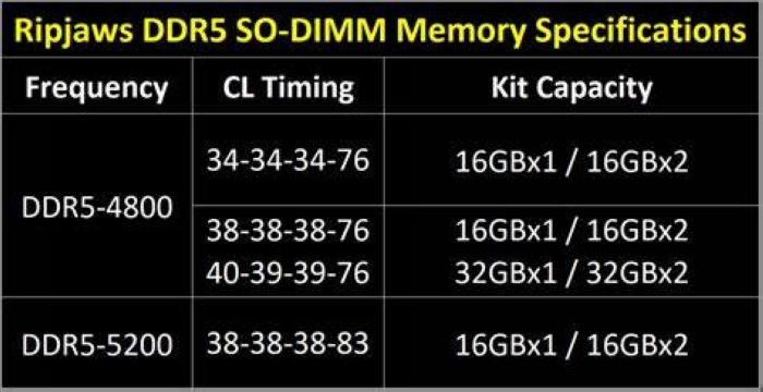 芝奇今天发布了旗下首款笔记本DDR5内存,属于 Ripjaws 系列,有16GB/32GB单条或2 x 16GB / 2 x 32GB套装可选,频率/时序方面,提供DDR5-5200(时序CL38-38-38-83)及 DDR5-4800(时序CL34-34-34-76 )版本可选。
