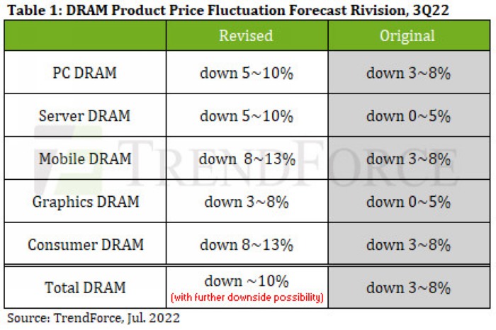 因此,集邦统计表示,Q3季度DRAM的供货价要比此前预计的3-8%降幅更大一些,环比Q2季度大约降 10%。如果DRAM之间再争抢而引发价格战,那么降幅可能超过10%。
