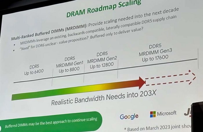 我们看到,当初 DDR5 内存的目标是6400 MHz,第一代 DDR5 MRDIMM 将提升到 8800MHz,第二代的 DDR5 MRDIMM 提升到 12800 MHz,到了 2030 年后会进入 DDR5 MRDIMM 第三代,这时候的频率将来到 17600 MHz。